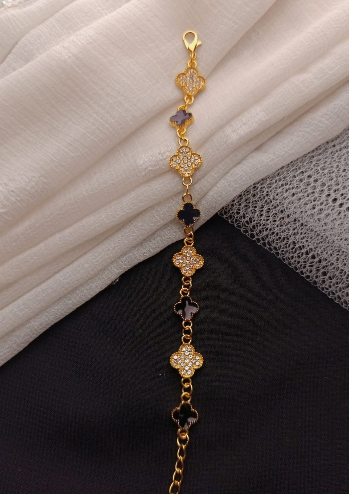 This elegant bracelet is a beautiful blend of classic and contemporary style. It features a delicate golden chain adorned with a series of alternating clover charms. Some are fully encrusted with brilliant, shimmering crystals, while others have a sleek, polished black enamel finish. The striking contrast between the sparkle and the deep black creates a sophisticated and eye-catching look, making this bracelet a perfect accessory for adding a touch of good fortune and glamour to your wrist.