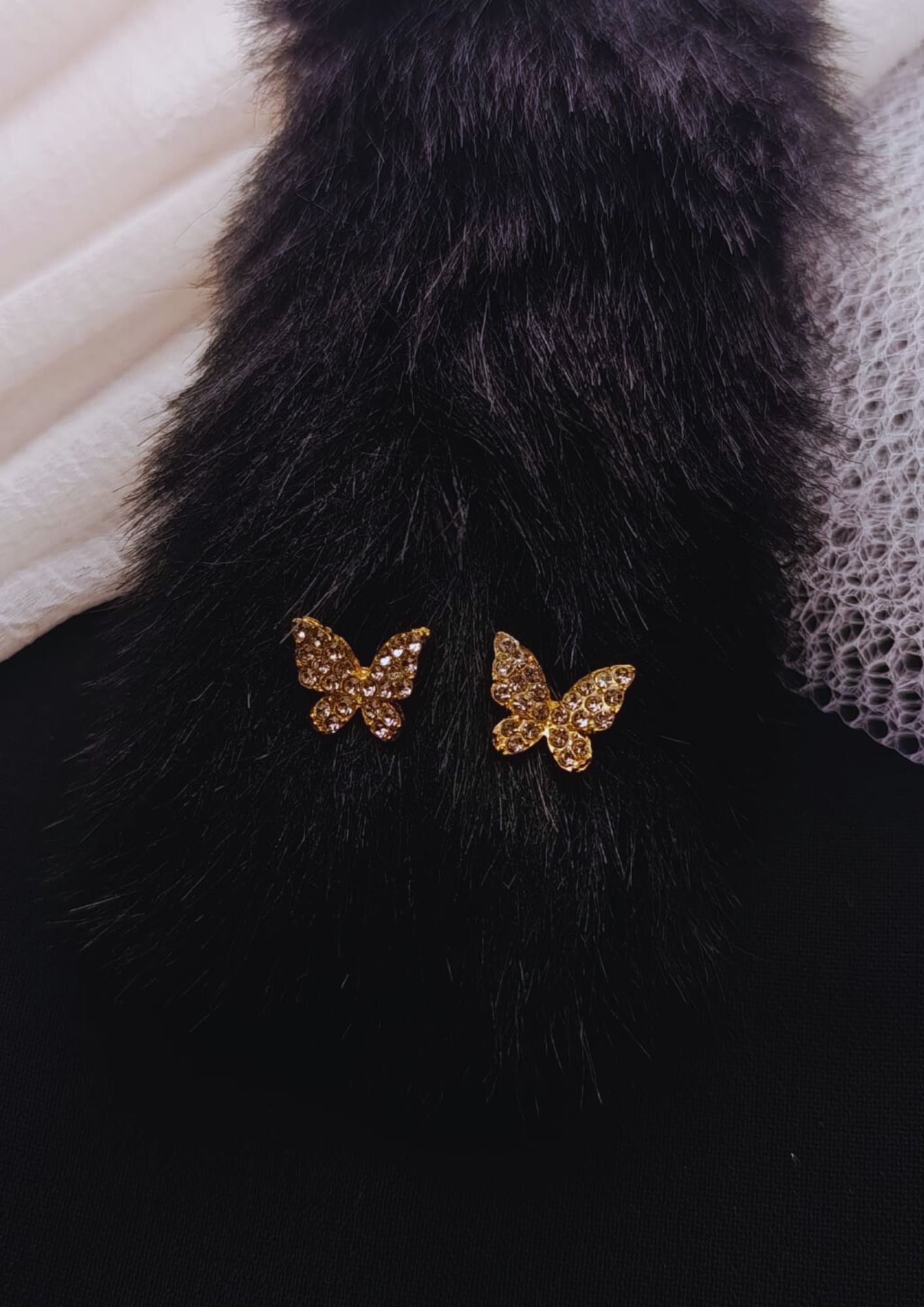 Add a whimsical touch of nature and sparkle to your ears with these charming butterfly stud earrings. Each earring features a delicate butterfly silhouette, its surface beautifully encrusted with brilliant, champagne-colored crystals that catch the light from every angle. The intricate design and elegant shimmer make them a perfect accessory to add a hint of glamour and personality to your daily look.