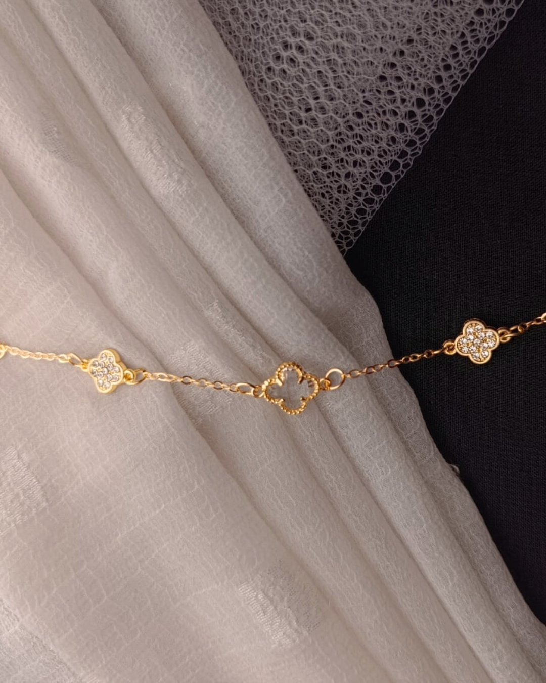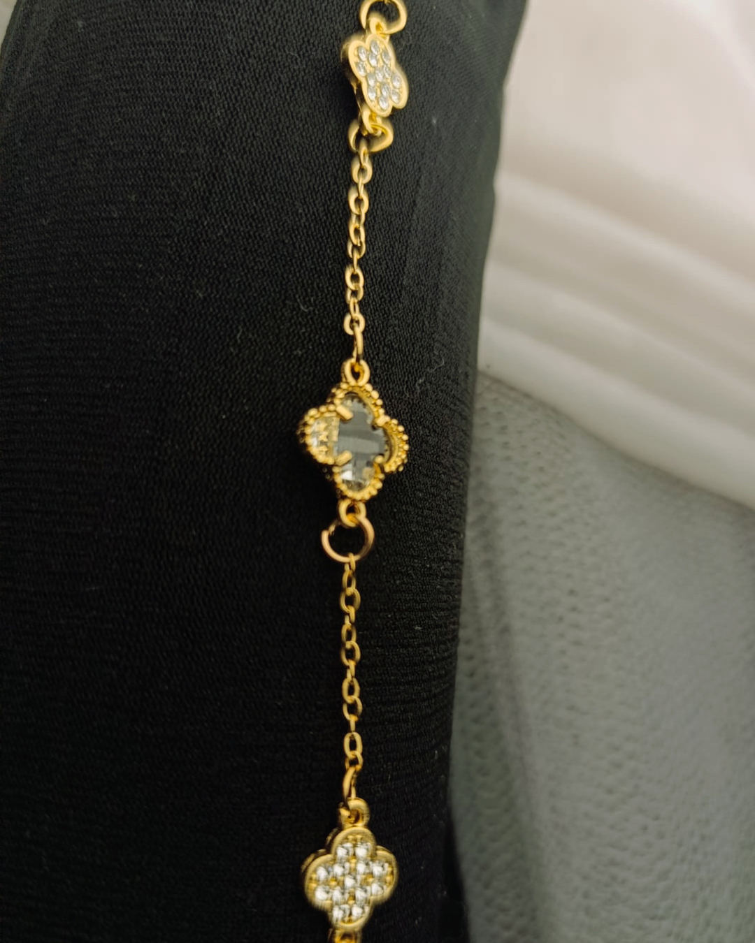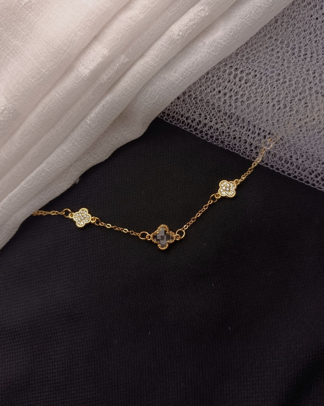 This delicate bracelet is a whisper of elegance on your wrist. It features a fine gold-toned chain with three beautifully crafted clover charms. Two of the charms are set with sparkling cubic zirconia, while the central charm stands out with a single, dark stone, creating a modern and sophisticated look. This piece is perfect for everyday wear and adds a subtle touch of charm to any outfit.