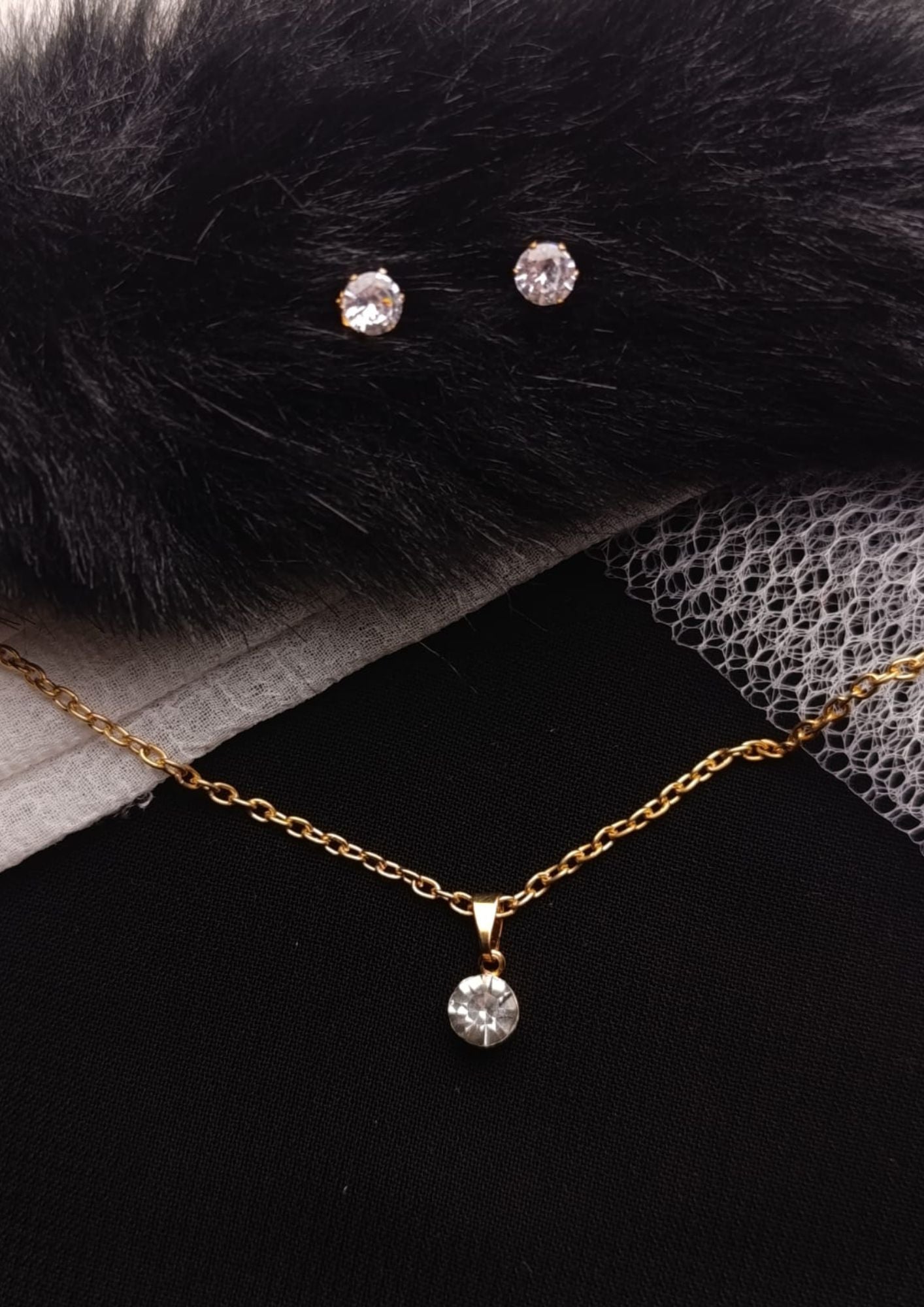 This beautiful and simple set is a timeless addition to any jewelry collection. It features a fine golden chain with a stunning round diamond pendant, designed to catch the light from every angle. The set is completed by a matching pair of elegant diamond stud earrings. Perfect for both everyday wear and special occasions, this set offers a touch of classic sophistication and brilliant sparkle.