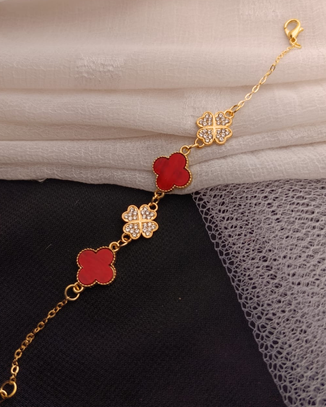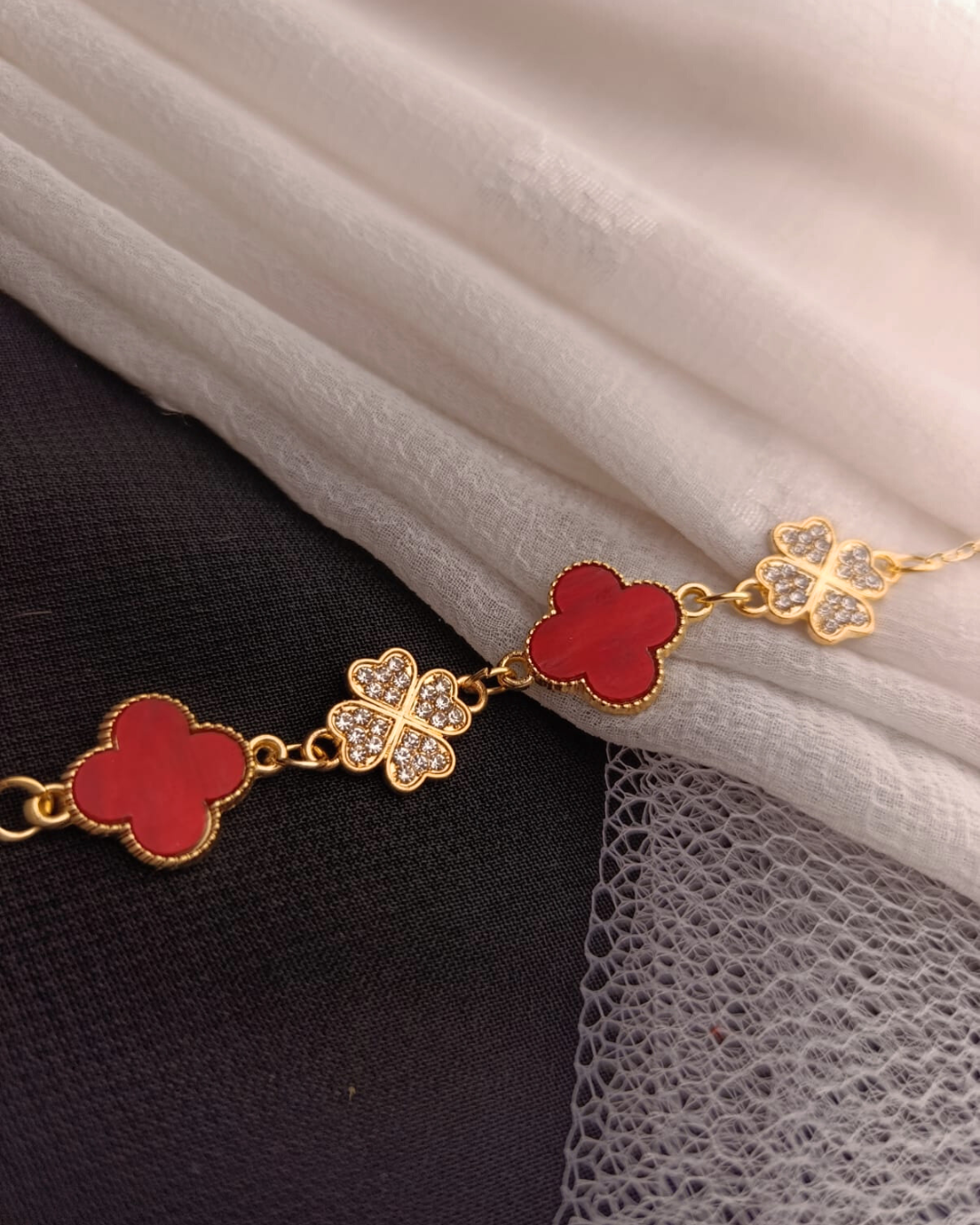 This isn't just a bracelet; it's a statement of luck and elegance. This stunning gold-plated bracelet features a delicate chain adorned with three charming clover motifs. The vibrant red enamel clover at the center adds a bold splash of color to your look, while the two smaller, crystal-studded clovers sparkle with every move you make. It’s the perfect accessory to elevate any outfit, whether you're heading to a special event or simply want to feel a little more fabulous every day.