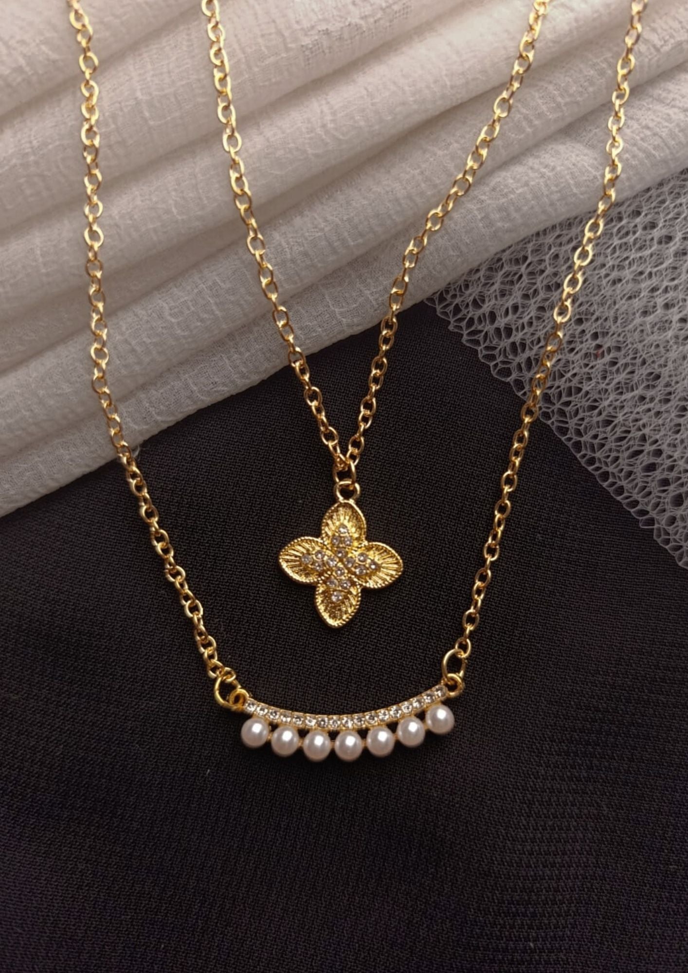 This beautiful double-layered necklace is a perfect blend of modern style and classic grace. The upper layer features a delicate gold-toned chain with a stunning textured clover pendant, its center sparkling with brilliant crystals. The lower layer holds a graceful, crescent-shaped bar adorned with a line of luminous pearls and small crystals, creating a sophisticated and eye-catching arc. This necklace offers a chic, pre-layered look that adds a touch of elegance and charm to any outfit.