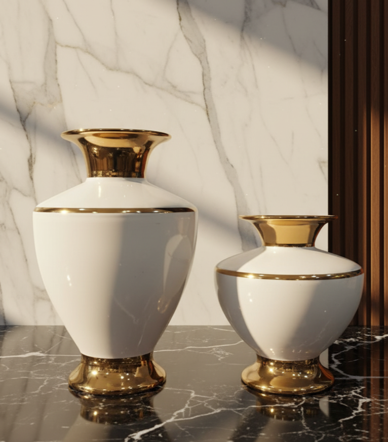 This beautiful set of two vases is the perfect addition to elevate any home decor. The vases feature a sleek, modern design with a crisp white body and a polished, metallic gold finish on the base and neck. The taller vase has a graceful, tapered silhouette, while the shorter one has a charmingly rounded shape. These versatile pieces can be used to display your favorite flowers or as stunning decorative objects on their own, adding a touch of sophisticated luxury to any room.