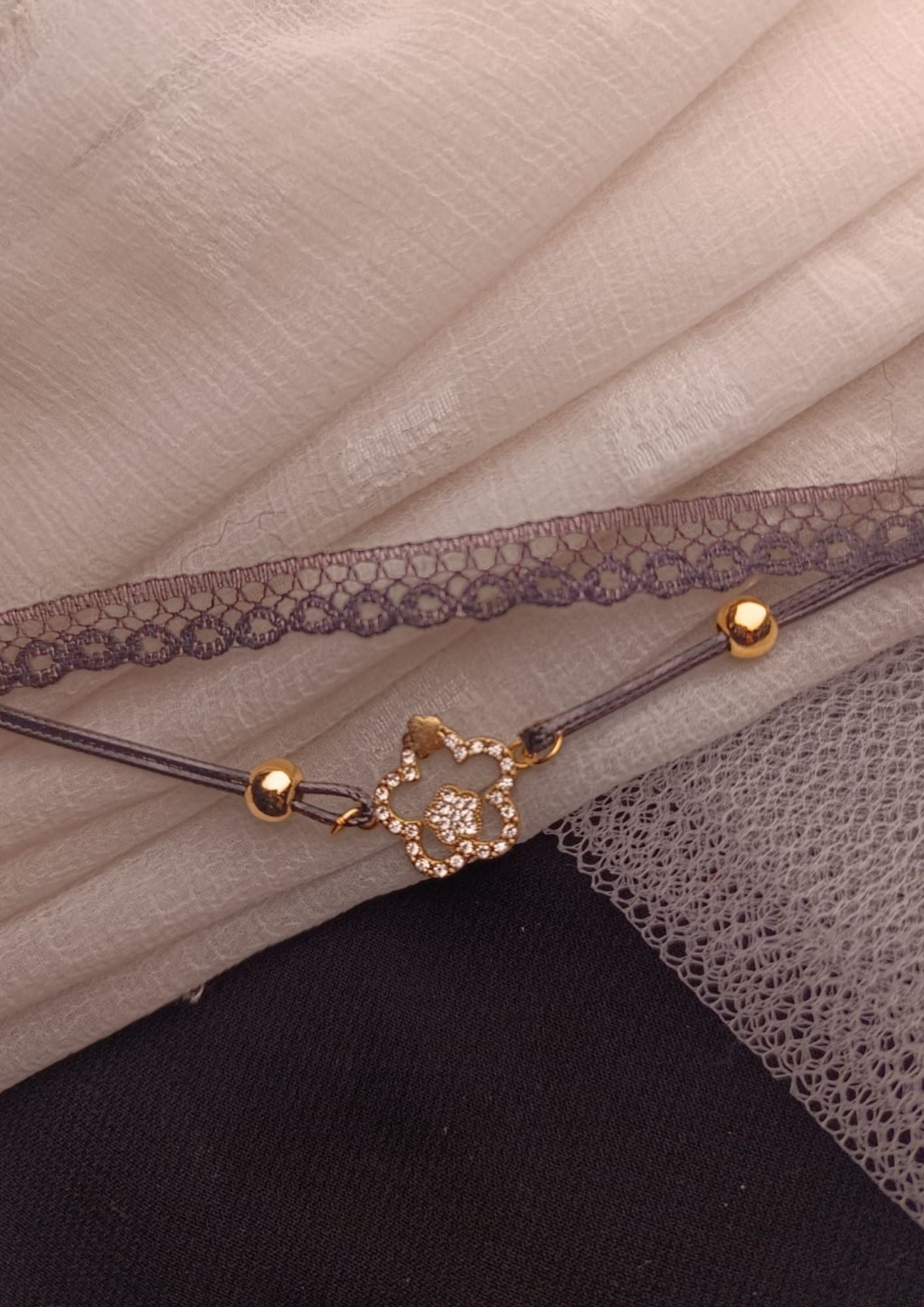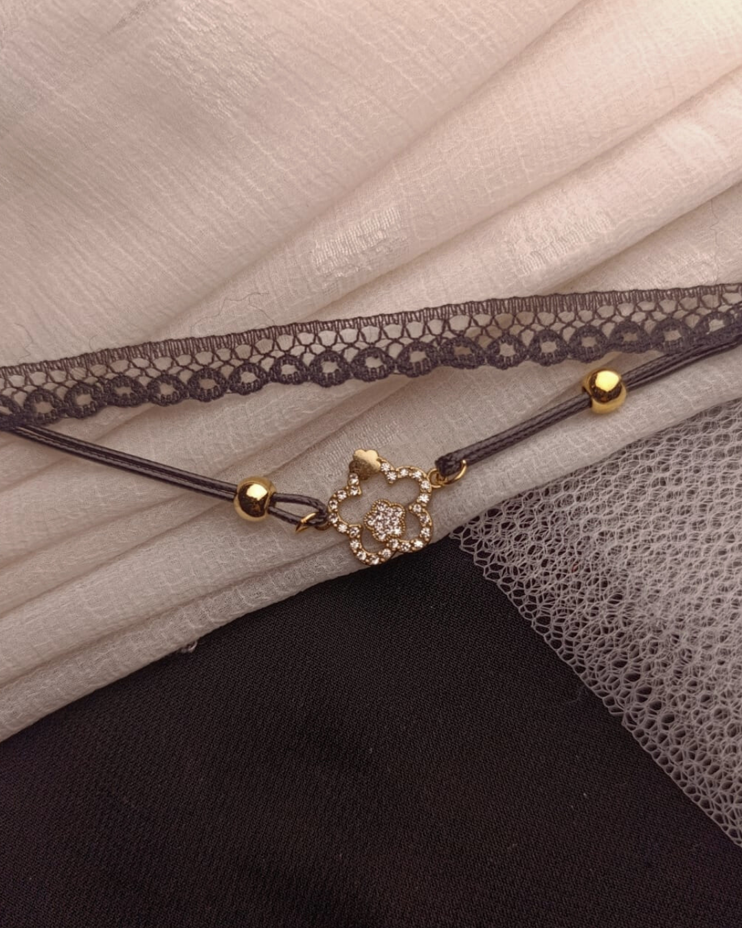 levate your style with this charming and unique choker necklace. It features a delicate grey lace band on the top layer, creating a soft and elegant texture. Below, a fine cord is adorned with two small golden beads and a stunning flower-shaped charm. This charm is intricately designed with a larger flower outline encasing a smaller, sparkling flower at its center, all studded with tiny clear crystals for a brilliant shimmer. This necklace is perfect for adding a touch of playful elegance and sparkle to any outfit.