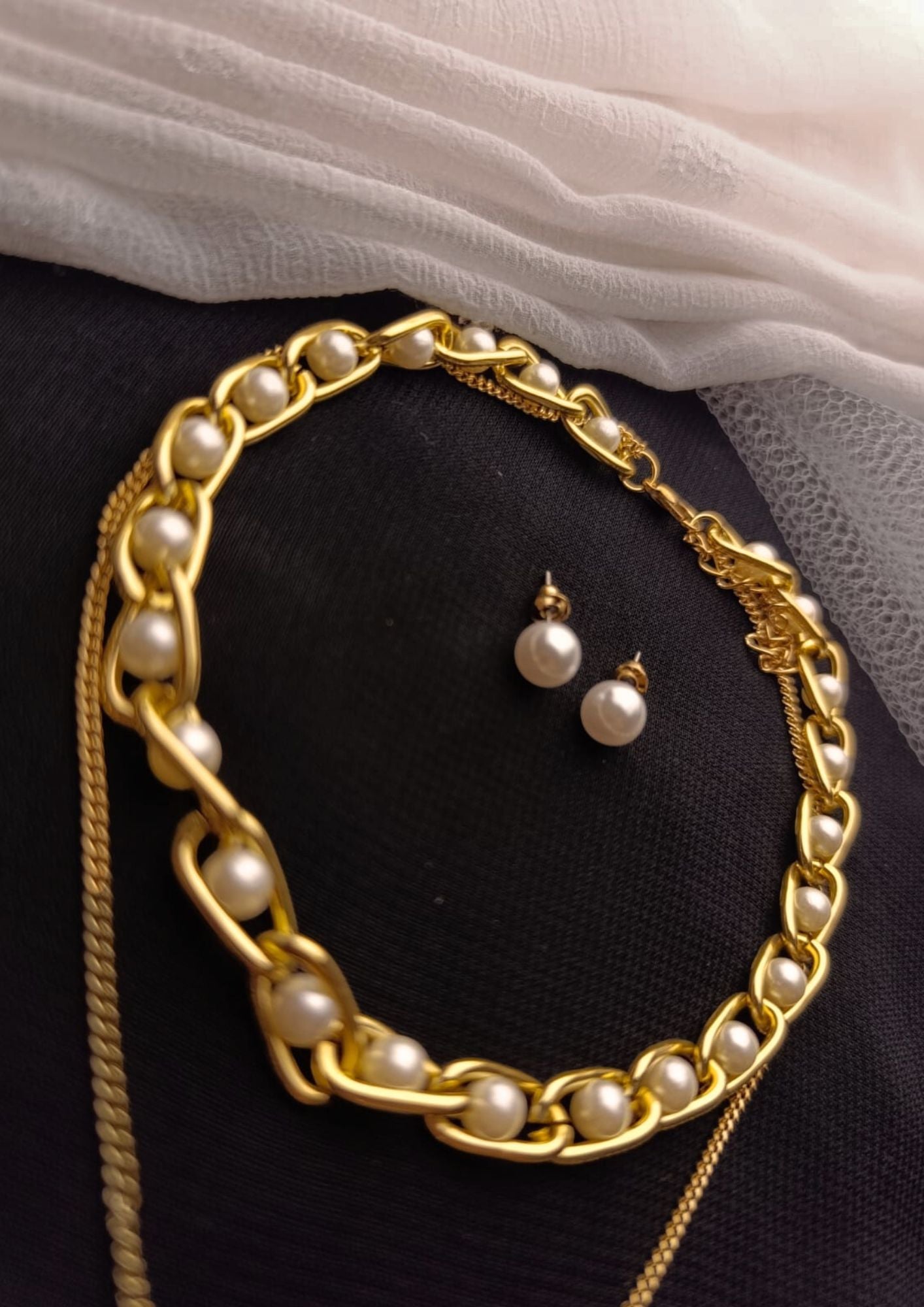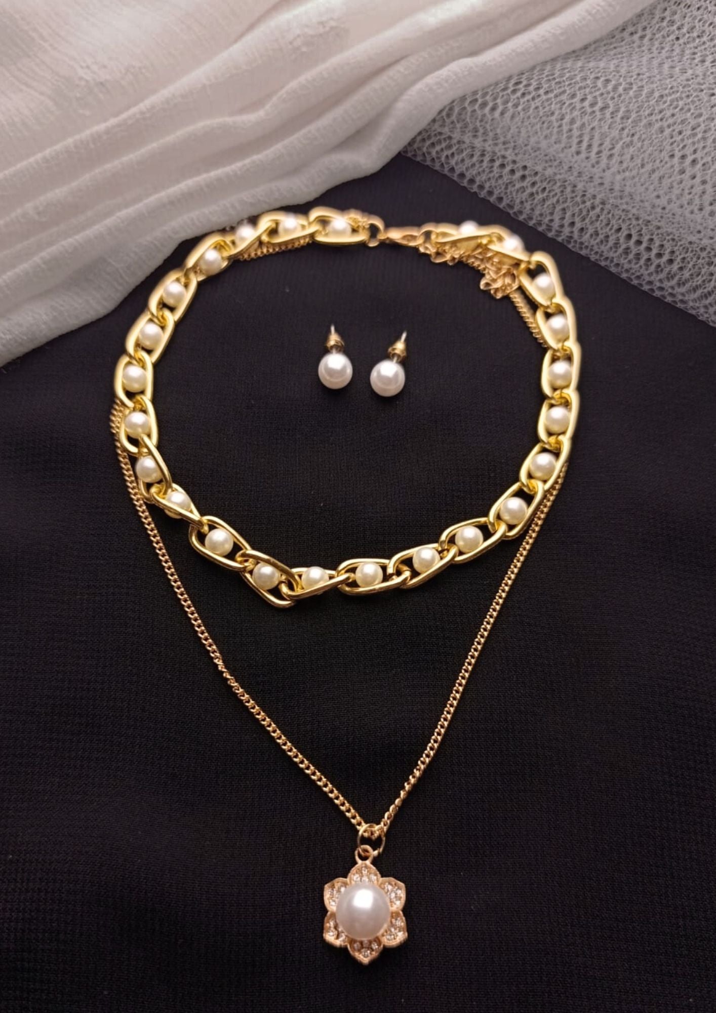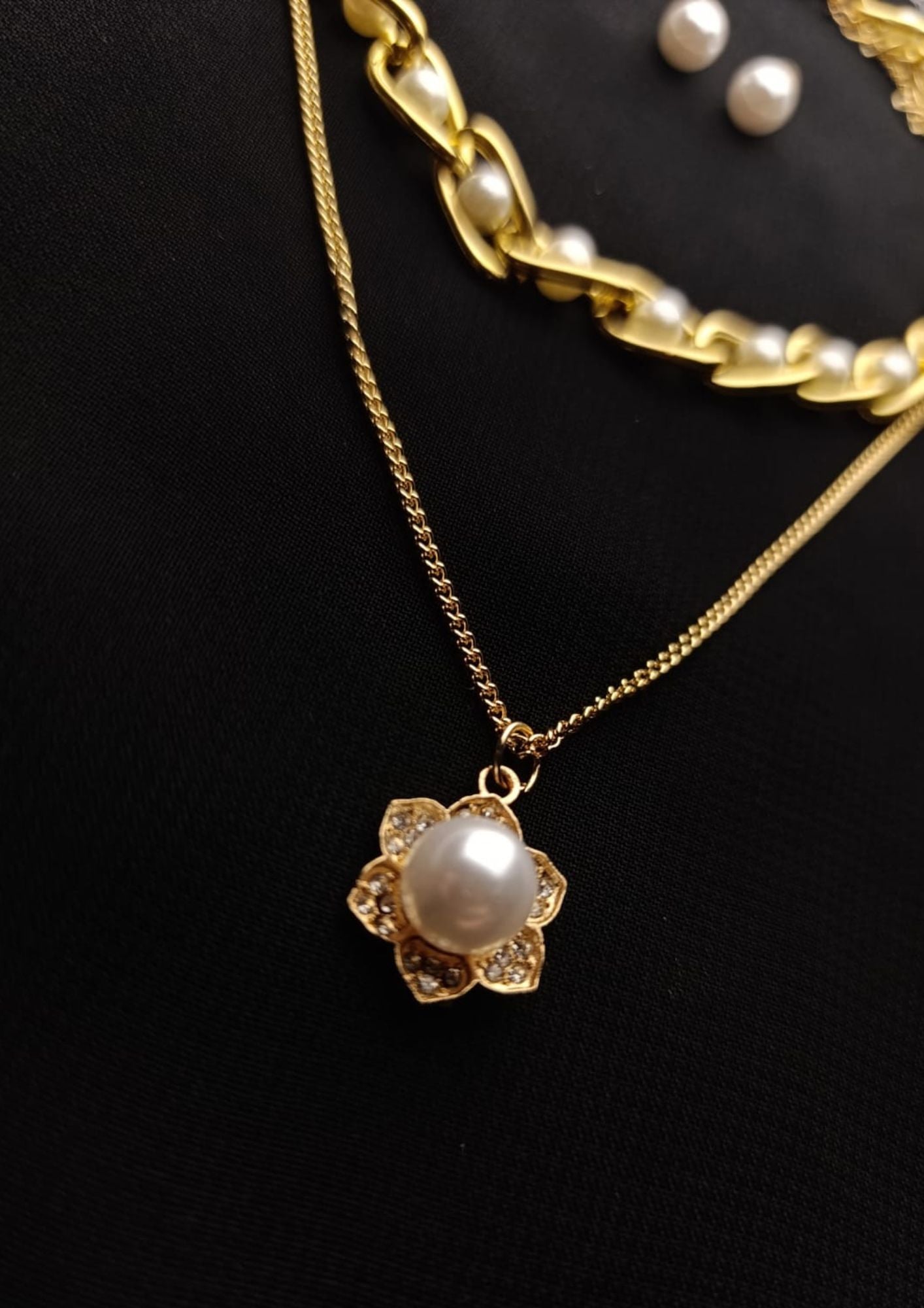 This beautiful set is a perfect blend of modern style and classic elegance. The double-layered necklace features a bold top layer of a chunky golden chain with luminous white pearls woven through each link, creating a unique and sophisticated look. The lower layer is a delicate chain that gracefully holds a stunning flower-shaped pendant with a large, central pearl and surrounding crystal accents. The set is perfectly completed by a pair of matching round pearl stud earrings, offering a timeless and cohesive look that adds a touch of luxury to any outfit.