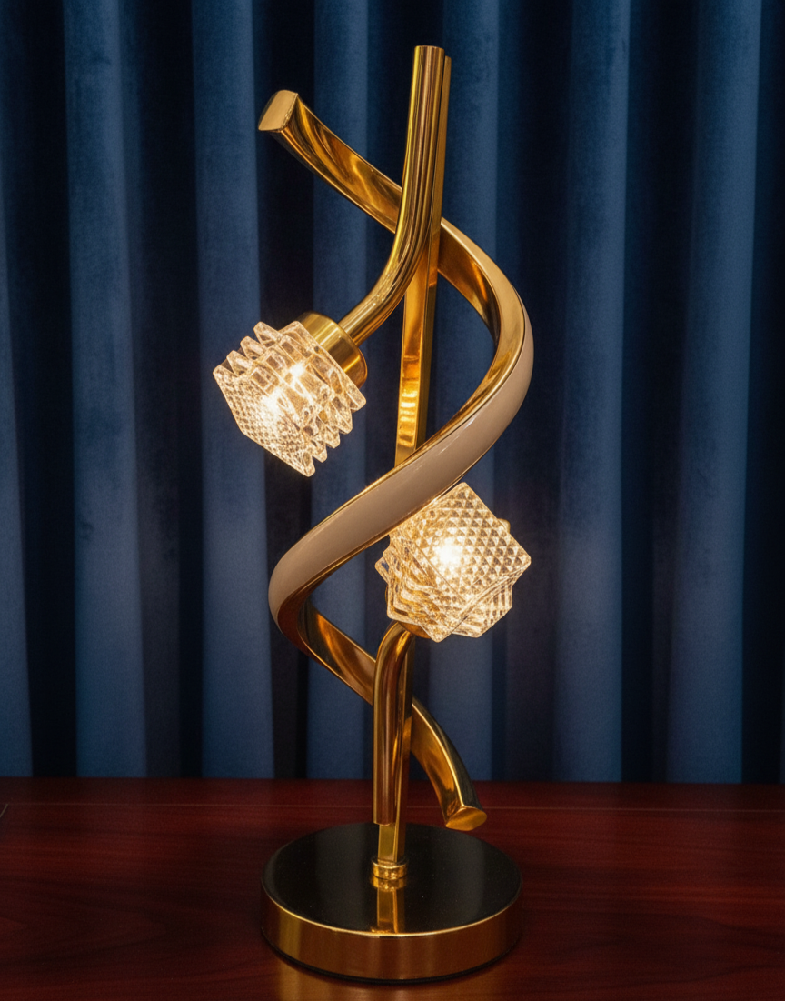 This stunning table lamp is a captivating piece of modern art, designed to illuminate your space with both light and style. It features a brilliant, polished gold-toned spiral frame that twists gracefully from a circular base. Two beautifully faceted crystal cubes are integrated into the design, serving as the light source and casting a dazzling glow. The unique sculptural form and elegant combination of gold and crystal make this a sophisticated and artistic accent for any room.