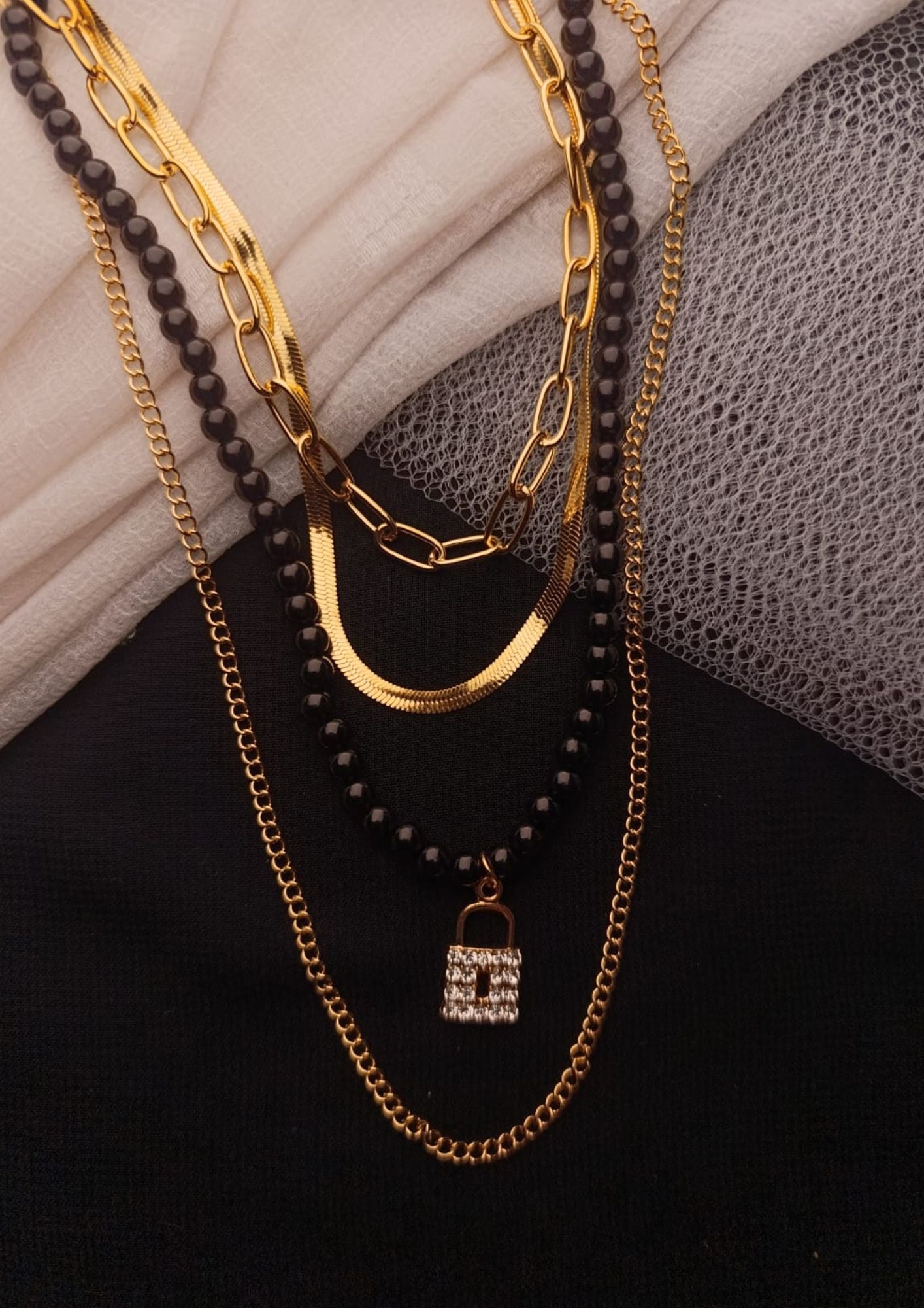 This bold, four-layered necklace is the ultimate statement piece. It features a striking combination of gold-toned chains and black beads, all styled together for a chic, pre-layered look. The design includes a sleek snake chain, a strand of polished black beads, a chunky paperclip link chain, and a delicate fourth chain that gracefully holds a small, elegant padlock pendant sparkling with crystals. This unique blend of textures and styles makes it a standout accessory perfect for adding a touch of modern edge and glamour to any outfit.