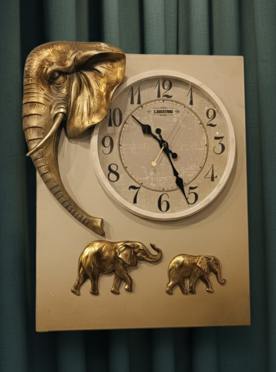 This stunning wall piece is a true work of art, combining a functional timepiece with a powerful, decorative design. The plaque features a magnificent, ornate golden elephant head with a downward-curving trunk, while two smaller elephants are sculpted walking below it. The integrated clock has a classic face with bold black numbers and hands, providing a simple yet elegant contrast. With its rich golden finish and detailed craftsmanship, this piece serves as a captivating and luxurious statement for any home or office.