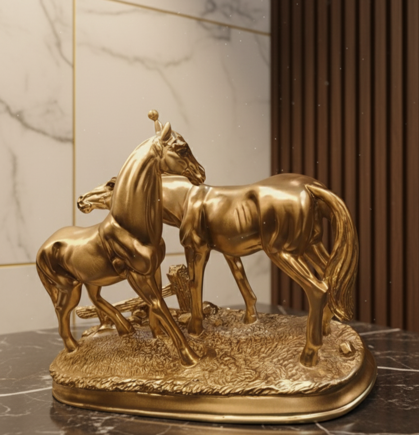 This majestic set of horse sculptures is a stunning and timeless decorative piece for any space. The set features a larger, standing horse and a smaller horse in a dynamic, graceful pose, all cast in a brilliant, polished gold finish. The intricate details of their musculature and the textured base they stand on add to their realistic and artistic appeal. This elegant pair makes a sophisticated statement on a mantel, shelf, or desk.