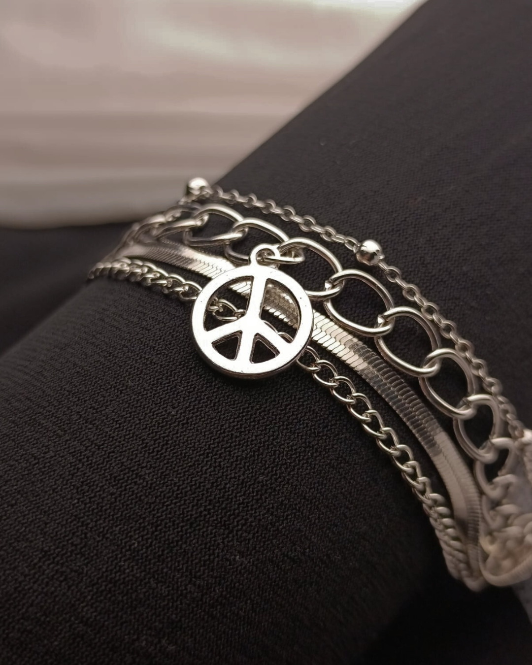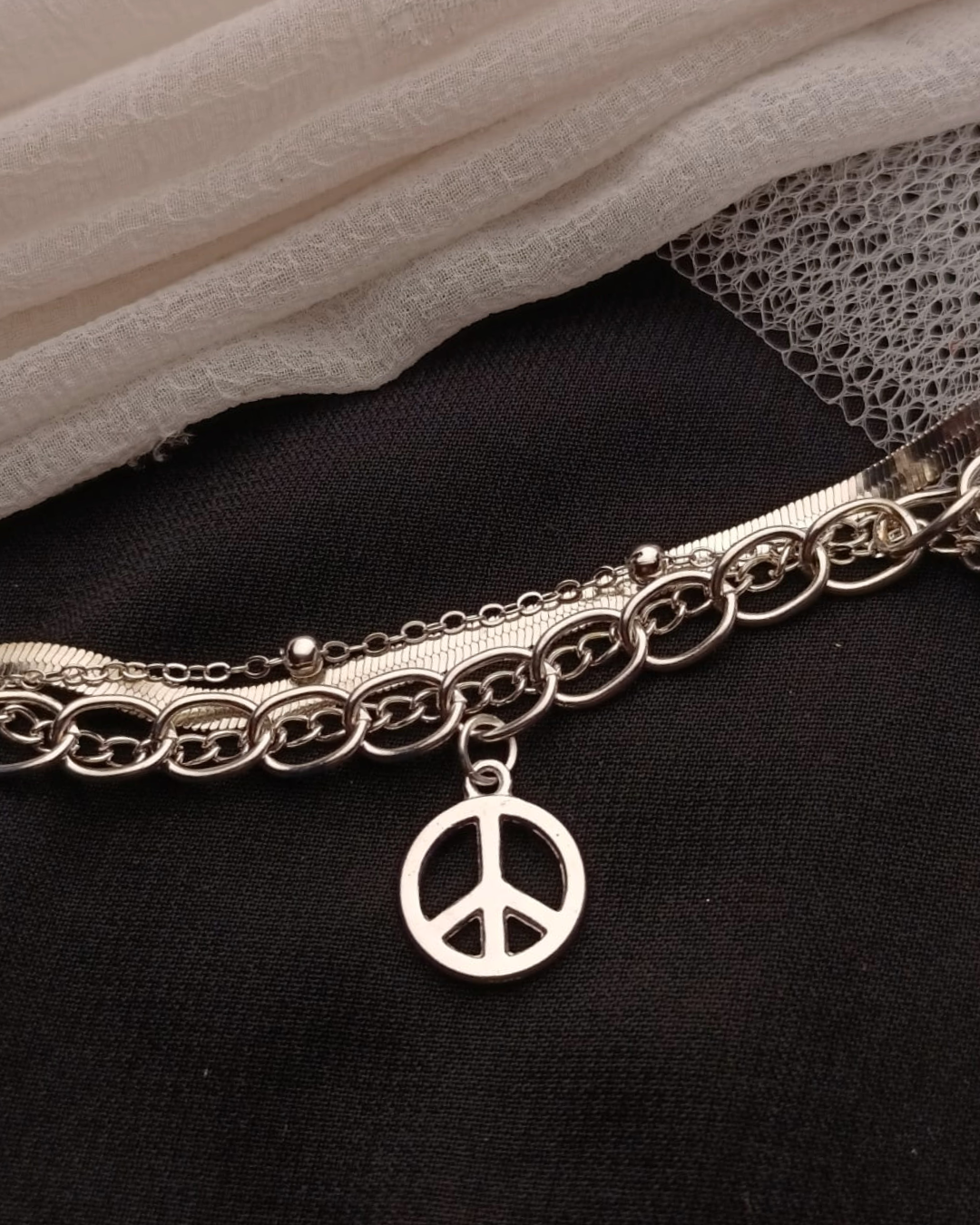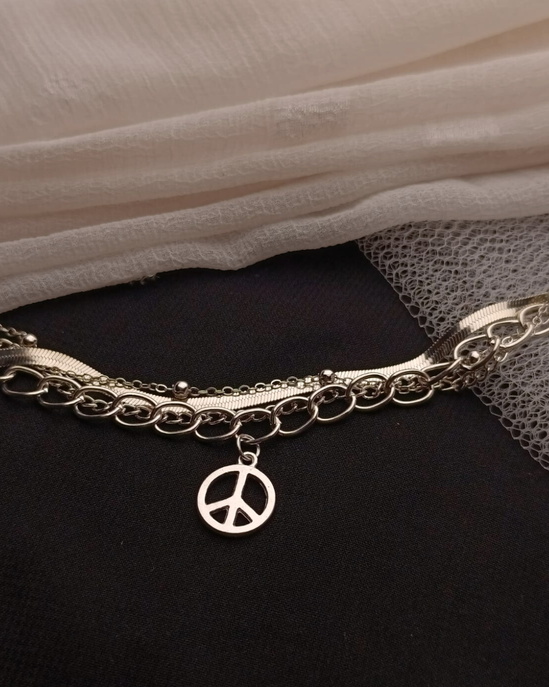 Express your style with meaning through the Silver Peace Charm Layered Bracelet. Featuring multiple sleek silver-tone chains and a classic peace symbol charm, this bracelet combines elegance with a touch of boldness.
